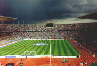 die Spieler machen sich warm, der Wettergott ahnt wohl schon den